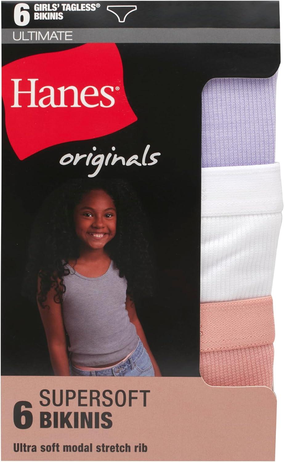 Hanes girls Originals Supersoft Bikini Underwear, Modal Rib Panties for Girls, 6-pack(Bikini – Purple/White/Peach 6-pack)