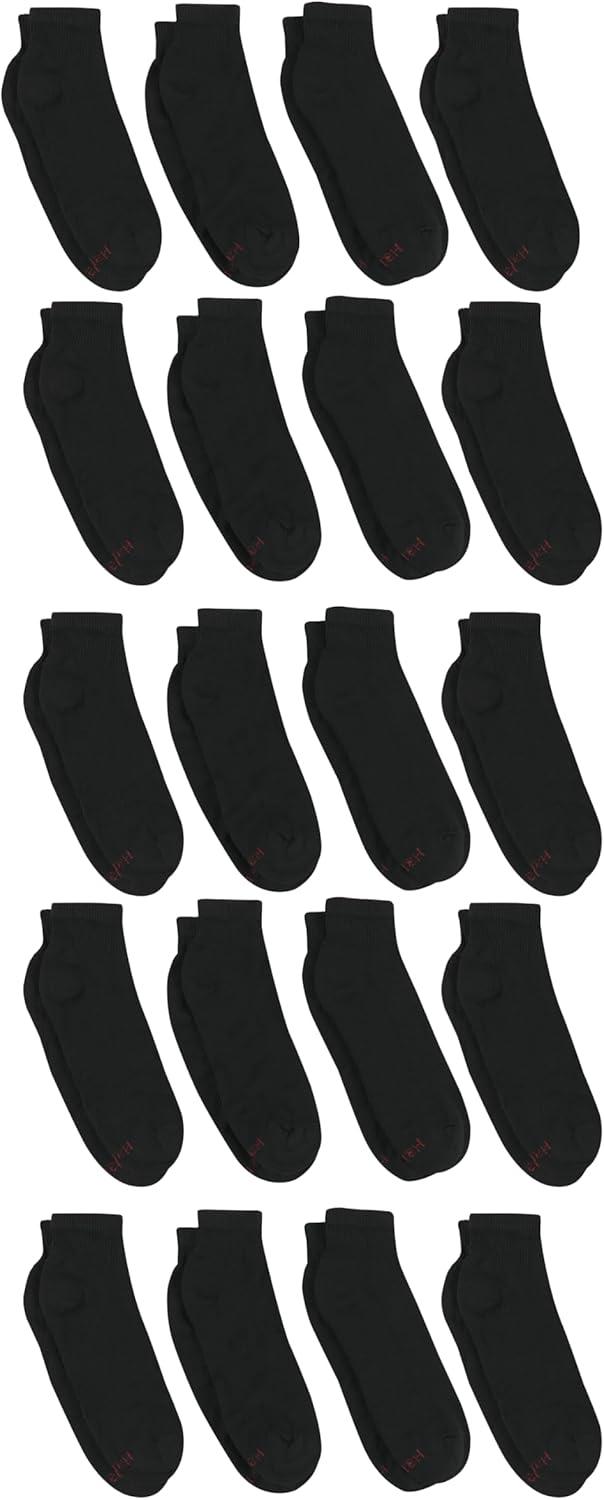 There's a lot to like in Hanes® Double Tough men's ankle socks. These ankle socks are made to last and cradle your foot while doing so with a reinforced, cushioned bottom you'll appreciate with every step. These classic ankle socks are made with Hanes' high-tech features, including Cool Comfort® fabric that wicks away moisture to keep feet cool and dry, and FreshIQ™ advanced odor-fighting technology that attacks odor-causing bacteria to keep feet smelling fresh. Smooth toe seams enhance comfort even more, and a touch of spandex in the poly-cotton knit assures a stay-in-place fit. Stock up on these made-to-last quarter socks in a convenient 14-pack and fill your sock drawer with comfort.
