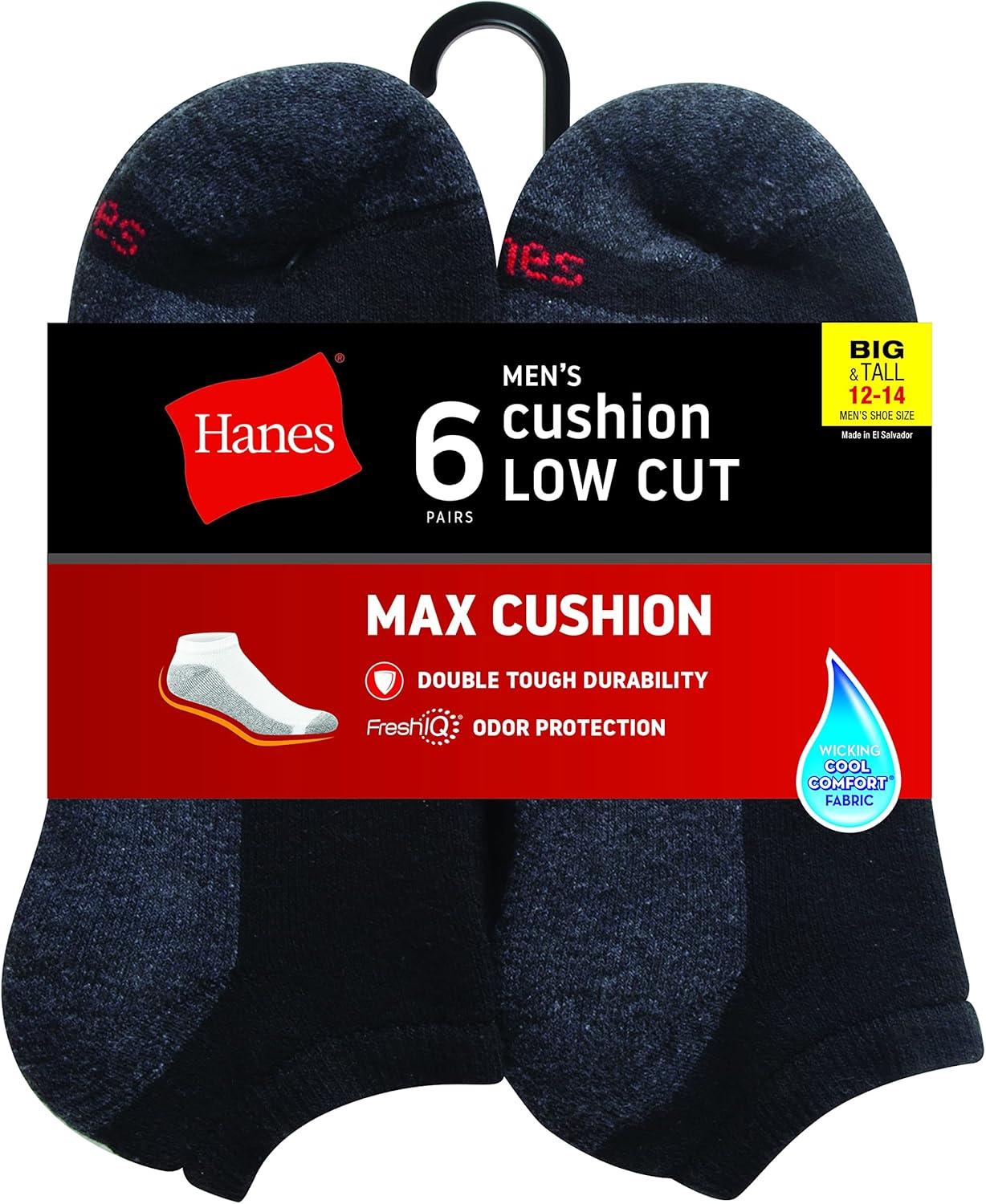 Hanes Men’s Max Cushion Low Cut Socks, 6, 8, and 12 Pair Pack, White and Black(Black/Grey – 6 Pair Pack)