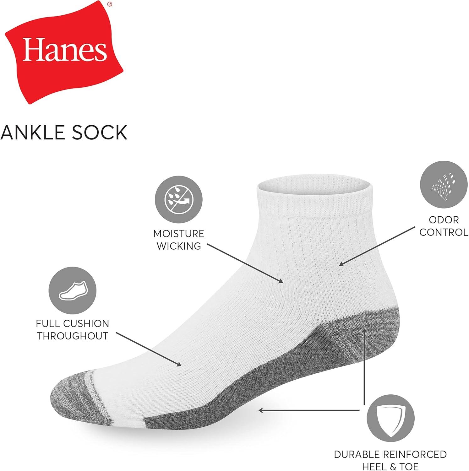 Hanes Men's Max Cushion Ankle socks will keep you comfortable all day. These socks are not only comfortable, but are durable as well, with Double Tough Durability. Wicking Cool Comfort Fabric will help keep your feet cool and dry. FreshIQ Advanced Odor Technology helps fight stinky feet! Spandex and Comfort Toe Seam will provide comfort and a better fit.