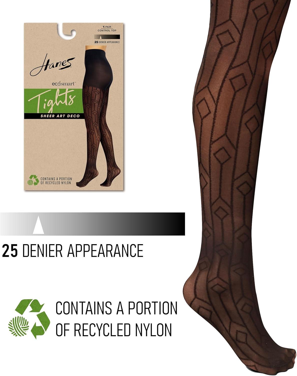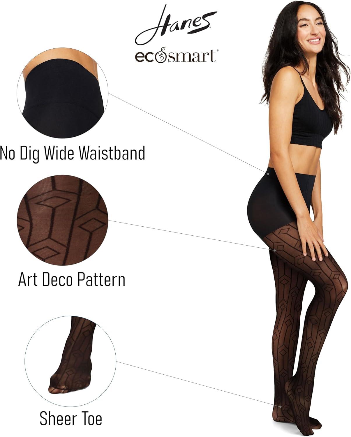 Hanes Women’s EcoSmart Fashion Sheer Art Deco, Control Top, Sheer Toe, Tights(Black)
