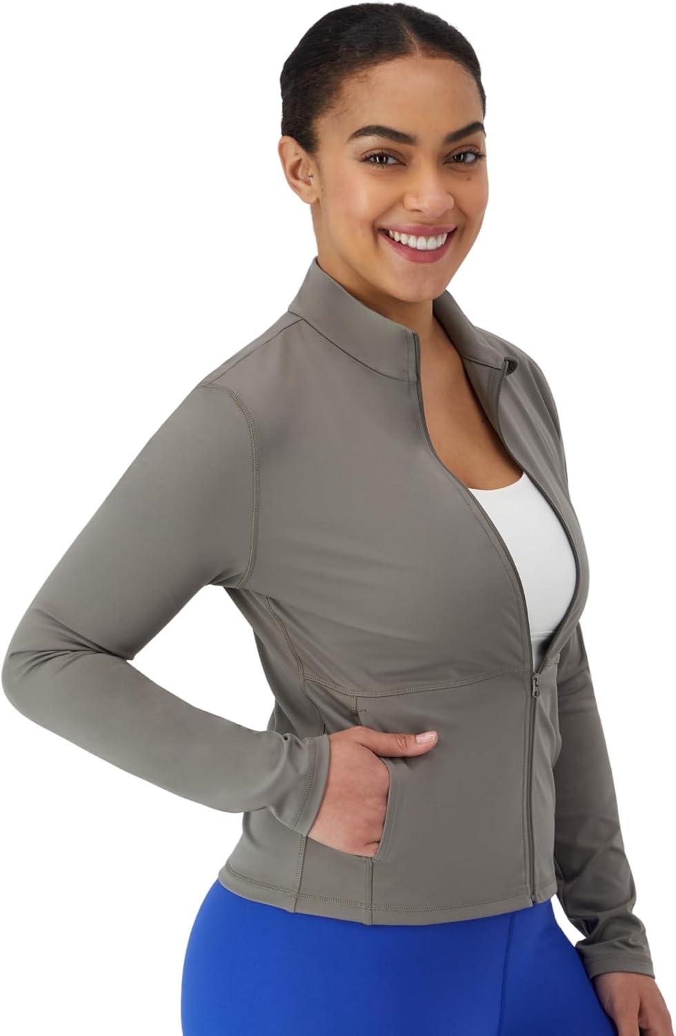 This soft and stretchy women's studio jacket from the Hanes Moves™ collection transitions nicely from the yoga mat to the gym to your favorite brunch spot. Crafted from peached interlock fabric, it is velvety-soft and wicks moisture from your skin – keeping you cool as your activity level heats up. The 4-way stretch ensures a made-to-move fit and the flexibility you need to tackle your day. An easy-to-layer design is both functional and attractive, with a full-zip entry and a mock neck collar. Finished with side pockets to stash the essentials, this women’s warm-up jacket is all about feeling good, staying comfortable, and moving without any limits. Hanes Moves. Ready for Anything.